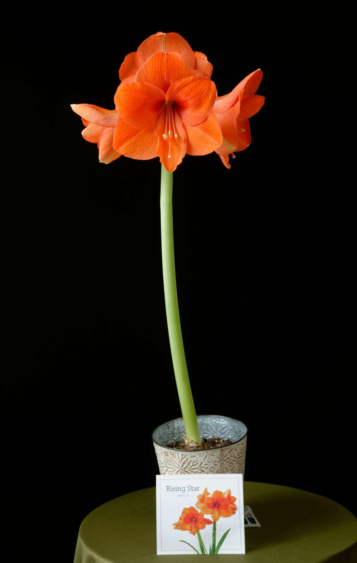 The scape itself was 56 cm tall ( a bit under 2 feet), so not as short as the Park Amaryllis website seems to suggest in stating that ‘Rising Star’ has short stems. It’s about average in height for a large flowered amaryllis. We see four 19 cm (7.48 inch) flowers of very broad, rounded form and saturated true orange color. It’s a beauty in our eyes! Though the provided colorful card shows two scapes and some foliage, we don’t see any foliage. The scape came from top dead center of the bulb nose, which likely means we won’t see a second scape either. We will let you know if it does. So, what’s going on with the other three?