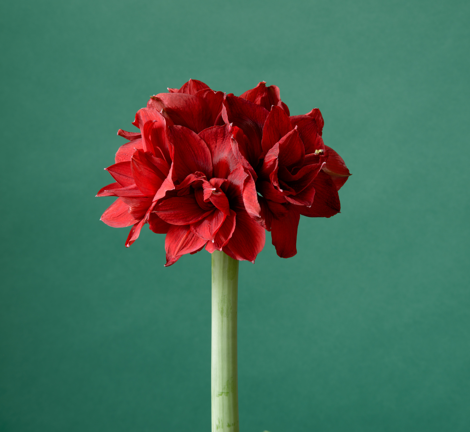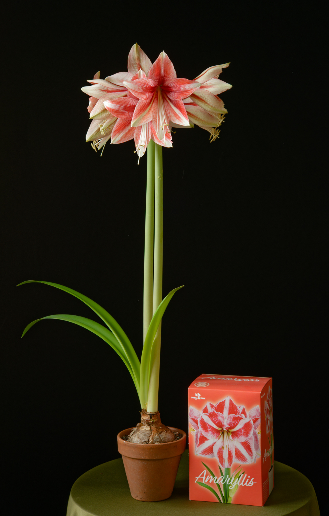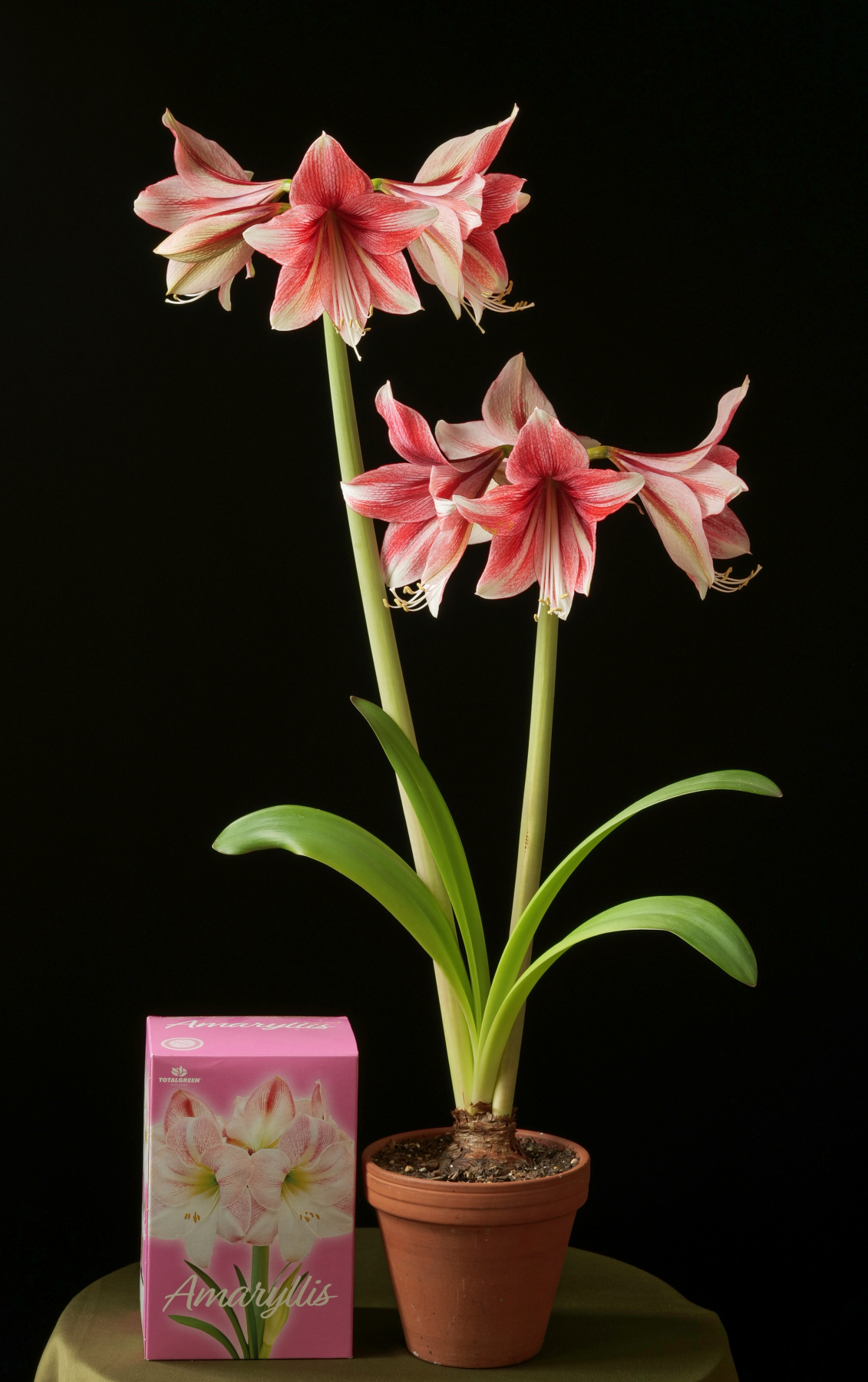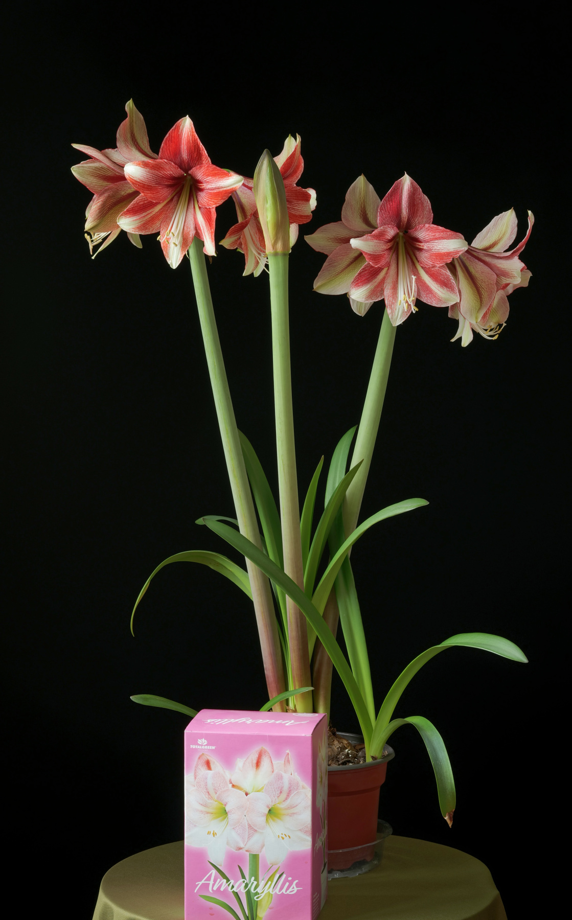 The thin, colorful scapes of the two most developed bulbs are the first clue to the question of whether these are actually ‘Apple Blossom’. They are not. That cultivar has thick, pale green scapes with a waxy bloom coating them. Neither of these is light green; both are dark and the spathe shielding the buds has some caramel rose tones. One has strong purplish pigmentation at the base. Now, the question is not rather they will be the clone photographed above, or ‘Apple Blossom’, but rather even these two examples are indeed two different hybrids. They are developing quickly, so we will know the answer in several days. Emaryllis is even more intrigued. Then, on the 10th of January, while innocently entering the local grocer for food only (we swear), the siren song of sale pricing gripped E once again. Amaryllis Anonymous should have been contacted for certain, but the addiction to bargains and amarylli are too much. We cave.