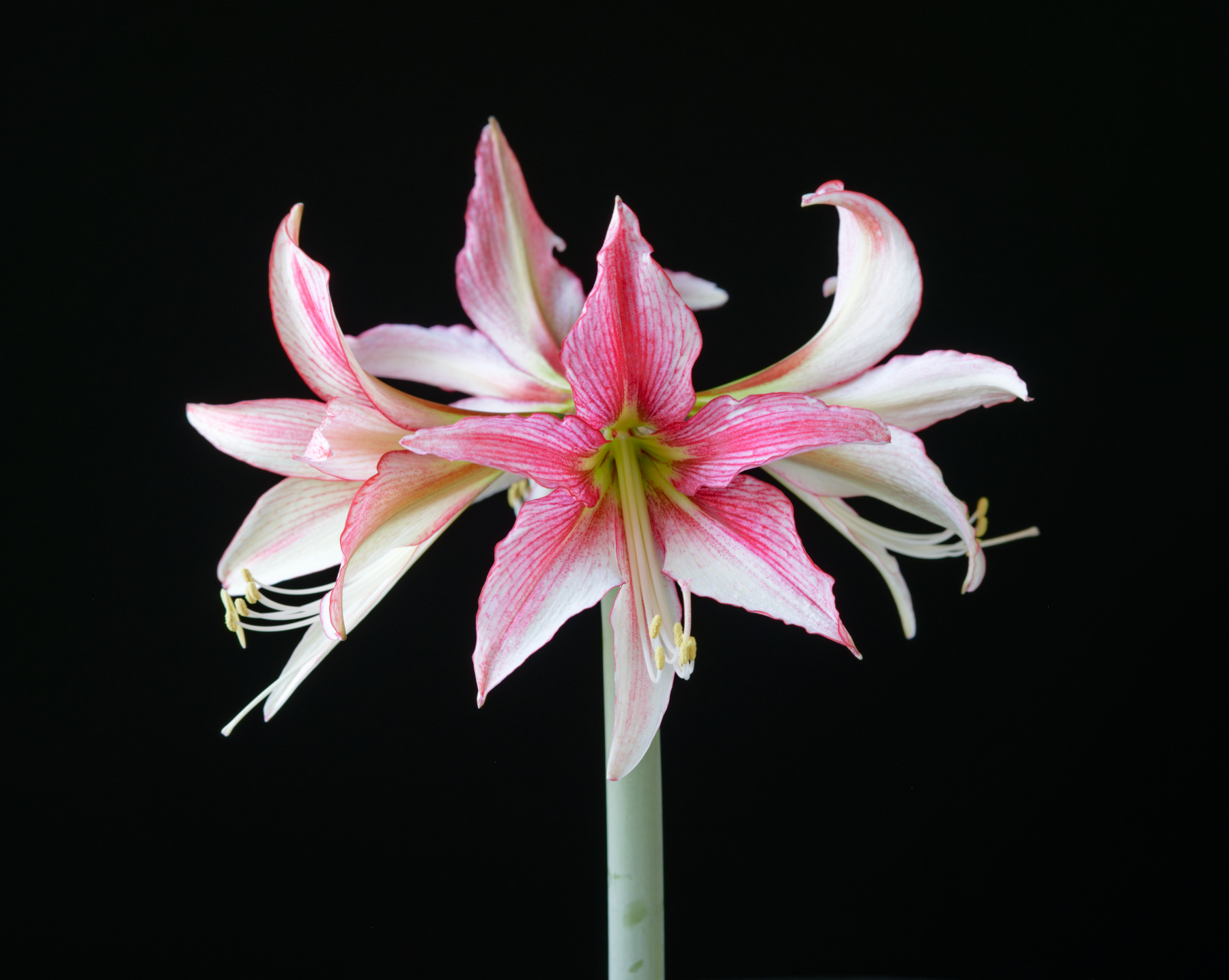 Below we have that second amazing scape. Unfortunately, the first was cut off prematurely, and there is a boo boo on the eldest flower here. The cause: a pot tipping over in the middle of the night. This is why I generally prefer heavier pots. While an unrooted bulb can list or lodge, even a rooted bulb in a snug pot can go crash, bang, boom in the night (causing nighttime panic and lost sleep here). A lightweight pot, lightweight media, and a robust, slightly leaning plant is all it takes. Now sleeved into a terra cotta pot for stability, it will be planted into such a pot if it is to hang around Rancho Emaryllis for another season. All in all, this was a great performance. If all we had to worry about was amazing vigor and productivity causing a topple, no qualms here. All kits should have such issues!