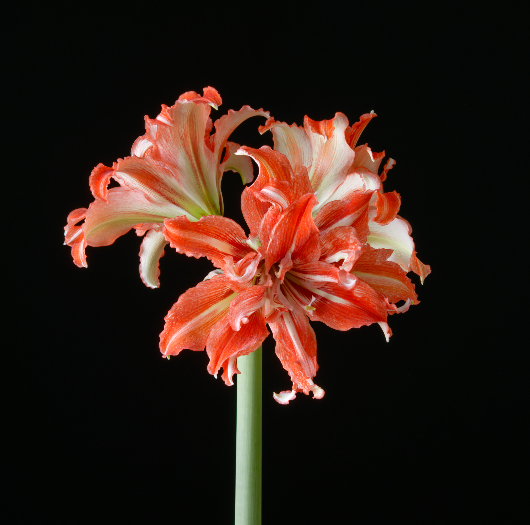 December 24, the night before Christmas, and in one sibling was creating a stirring sight! A tall and strong scape is bearing two beautiful, fully double flowers of red oops…rather orange and white. Wasn’t this supposed to be deep red and white? You guessed it, the all-to-familiar sight of a mislabeled amaryllis bulb. No ‘Exotic Peacock’ which has been hard to find, but a common (yet nice) double with somewhat different coloration. Sigh.